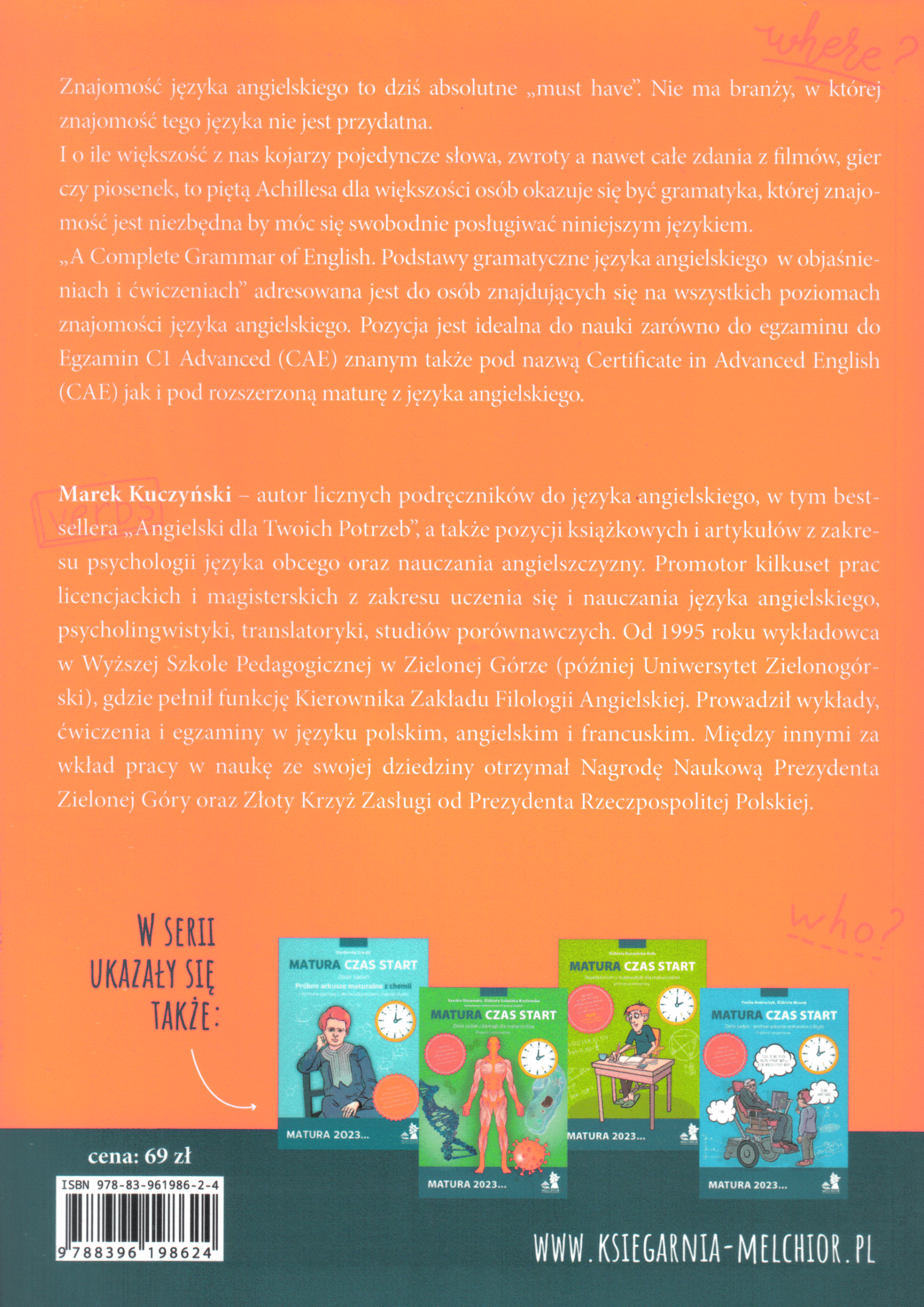 O Autorze: Marek Kuczyński – autor licznych podręczników do języka angielskiego, w tym bestsellera „Angielski dla Twoich Potrzeb”, a także pozycji książkowych i artykułów z zakresu psychologii języka obcego oraz nauczania angielszczyzny. Promotor kilkuset prac licencjackich i magisterskich z zakresu uczenia się i nauczania języka angielskiego, psycholingwistyki, translatoryki, studiów porównawczych. Od 1995 roku wykładowca w Wyższej Szkole Pedagogicznej w Zielonej Górze (później Uniwersytet Zielonogórski), gdzie pełnił funkcję Kierownika Zakładu Filologii Angielskiej. Prowadził wykłady, ćwiczenia i egzaminy w języku polskim, angielskim i francuskim. Między innymi za wkład pracy w naukę ze swojej dziedziny otrzymał Nagrodę Naukową Prezydenta Zielonej Góry oraz Złoty Krzyż Zasługi od Prezydenta Rzeczpospolitej Polskiej.